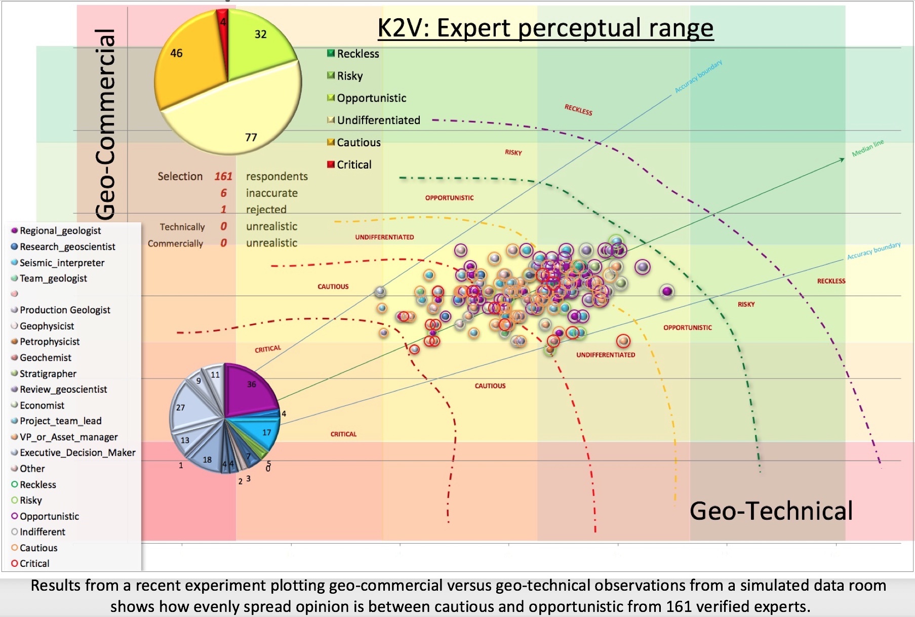 Crowd-sourcing techniques have been tried and tested in the North Sea by pioneering organisations such as Draupner Energy and Geonova. Focus to date has been to attract investment on individual opportunities which has demonstrated that crowd-sourcing opinion does work within the relatively limited range of interrogations used. Rose & Associates have done much to make the oil & gas sector think carefully about the dangers of cognitive bias and perceptual blindness [5]. In 2017, an experiment was launched using a simulated dataroom to establish if independent crowd-sourced opinion was capable of providing the means to mathematically collapse cognitive bias [6] in support of decision making. The challenge was to establish what size of population is needed to achieve a statistically valid result (ibid. critical mass). 350 geoscientists have so far participated in the experiment, which was supported by live lecture tours to a number of geology faculties and organisations around Britain. Participants were supplied with an information pack of three summary slides containing commercial background, play and prospect information, and were invited to role play. As with every data room, there were both gaps in information and an oversupply of detail in some areas. Participants were asked to indicate whether they would elect to participate in an opportunity (i.e. judgment or “gut feel”) and their responses were compared with a calculated value derived from 20 geo-technical and geo-commercial metrics (i.e.powers of observation - Fig. 2). Where individuals plot in Fig. 2 is still a guess but it is more accountable than the overall judgment because it is under-pinned by premises that we recognise. In effect, we establish the credibility of the whole by summing its parts and then comparing the two as separate perspectives to examine the differences (calibration).