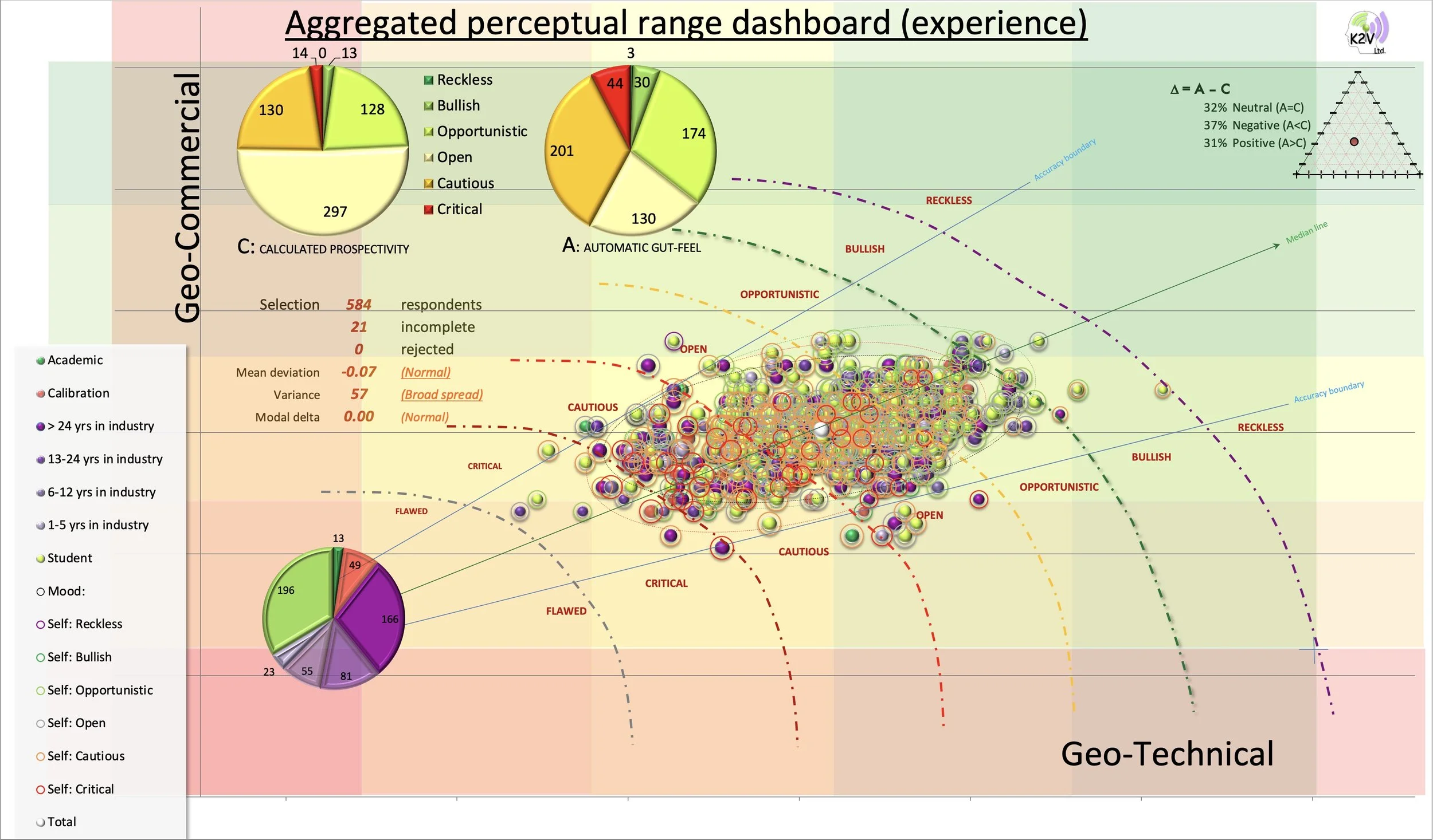 The main bubble chart aggregates individual submissions from a compilation of simulated data rooms, which appear as bubbles coloured by years of experience on Geo-commercial vs Geo-technical axes (calculated from 15 metrics) on a climbing scale (1-5) of relative attractiveness [1) critical, 2) cautious, 3) open, 4) opportunistic and 5) bullish]. The size of the bubble is determined by the total score, the colour by functional role (see legend) and the colour of the “halo” by the respondent’s automatic gut-feeling for the opportunity. The large white bubble in the centre is the aggregated average.