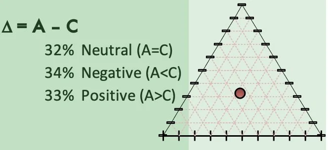 The two pie-charts at the top of the dashboard rollup calculated prospectivity (C - on the left) and automatic responses (A - on the right). C is calculated from the same 15 metrics in the main chart, whereas A represents a rollup of the self-reported Automatic, or intuitive opinion of respondents. Note that there is a slight skew towards the action in both plots but the real difference is in the yellow “open” wedge. C shows that over half of the participants’ evaluations classed as “open”, which is halved in A. In other words, A is much more polarised than C. A minus C (Delta) represents the perceptual gap identified by the simulation exercise. There are three categories represented by the delta:
