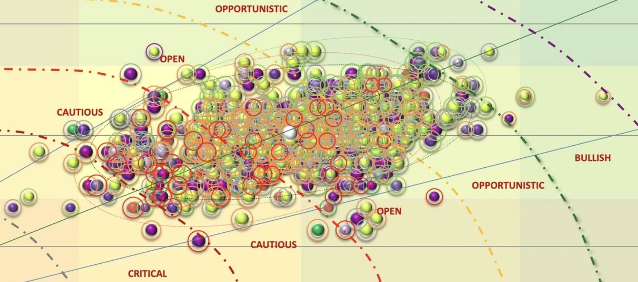 The “Perceptual Range” dashboard is a compilation of 5 charts on one display consisting of a main bubble chart, with 3 supporting pie-charts and a ternary chart, each visualising different elements of participant perceptions of value. All the charts accumulate live as participants submit their individual assessments of an opportunity.